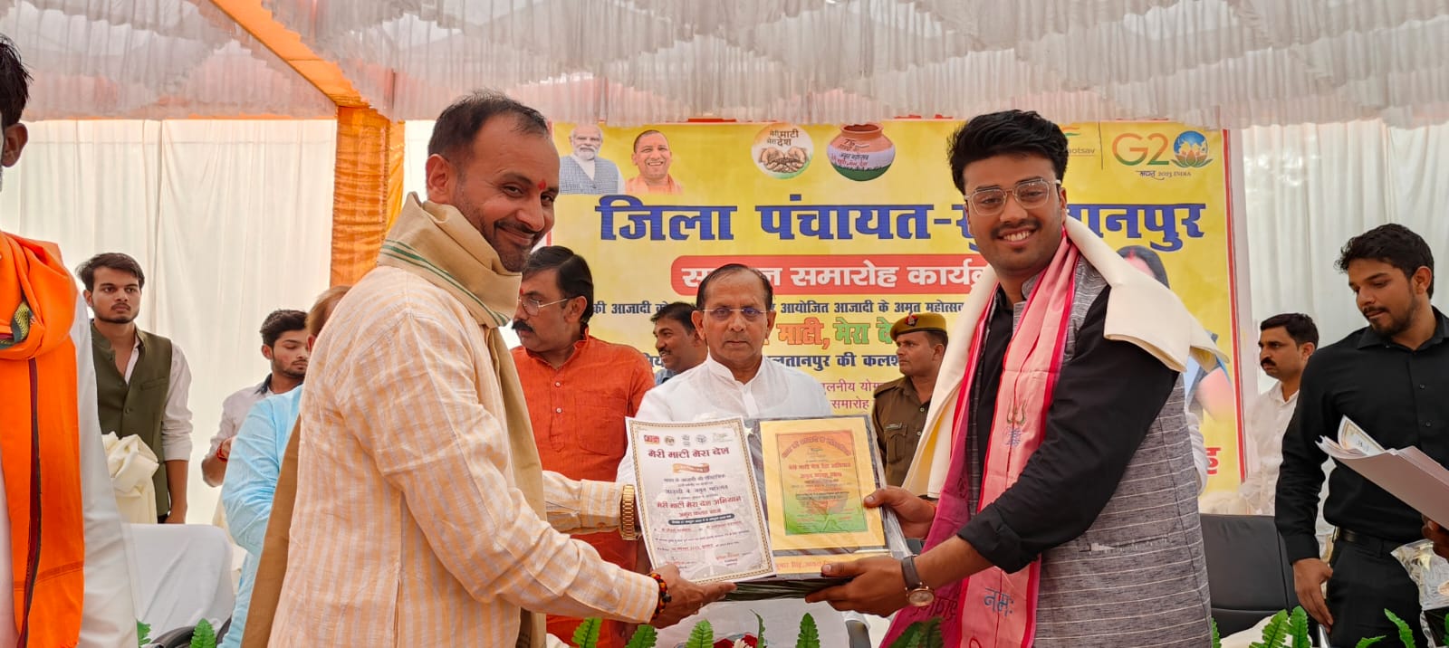 सुल्तानपुर: जिला पंचायत परिसर में आयोजित मेरी माटी, मेरा देश अंतर्गत सम्पूर्ण भारतवर्ष में एक अलग छाप छोड़ने में जनपद सुल्तानपुर का पीतल से बना पांच फीट का कलश अपनी पूरी चर्चा बटोर कर जो मुकाम हासिल किया उसके लिए जनपद से कलश यात्रा को लेकर जाने वाले एन. वाई. के, युवक मंगल दल व स्वयं सेवी संगठनों के युवाओं व जनपद प्रशसनिक कर्मचारियों को जिला पंचायत अध्यक्ष ऊषा सिंह, विधायक राजप्रसाद उपाध्याय, विधायक ताहिर खां, विधायक सीताराम वर्मा ब्लाक प्रमुख शिव कुमार सिंह, मुख्य विकास अधिकारी अंकुर कौशिक और अपर जिलाधिकारी प्रशासन पंकज सिंह ने प्रतिभाओं को शाल भेंट कर दिया स्मृति चिन्ह एवं मेरी माटी मेरा देश प्रशस्ति पत्र। 5 फुट के अमृत कलश के सफलता पूर्ण ढंग से दिल्ली पहुंचने पर जिपं अध्यक्ष प्रतिनिधि शिवकुमार सिंह द्वारा किया गया आयोजन।