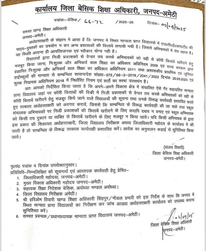 अमेठी। जिले के वित्तविहीन मान्यता प्राप्त स्कूलों में निजी प्रकाशकों की किताबें थोपने पर रोक लगाने के लिए बीएसए अमेठी द्वारा 2 अप्रैल को जारी आदेश ने नयी बहस छेड़ दी है। आदेश में एनसीईआरटी/एससीईआरटी की पुस्तकों को अनिवार्य करने की बात तो है, लेकिन इसकी देरी ने खुद शिक्षा विभाग की नीयत और गंभीरता पर सवाल खड़े कर दिए हैं।