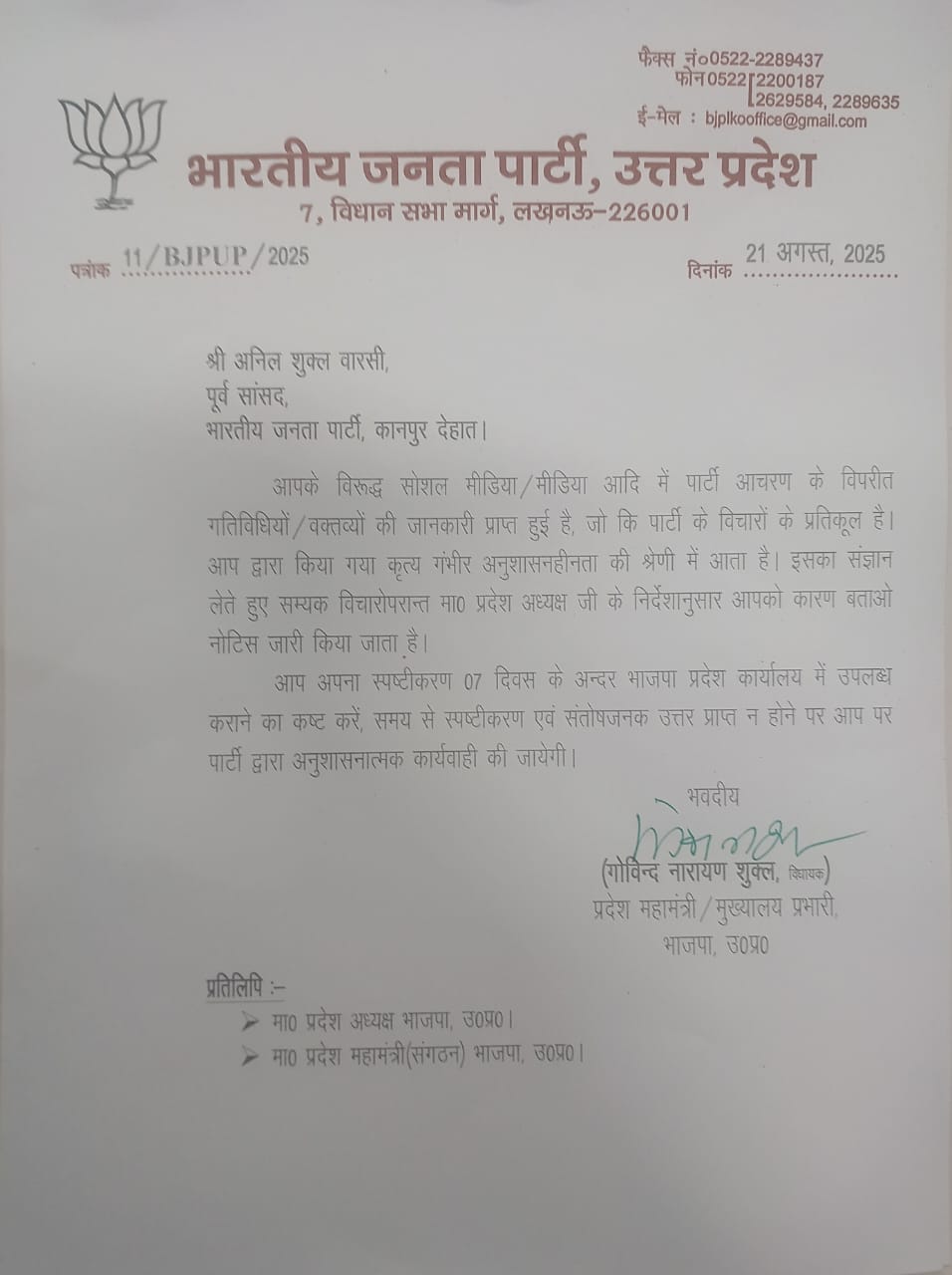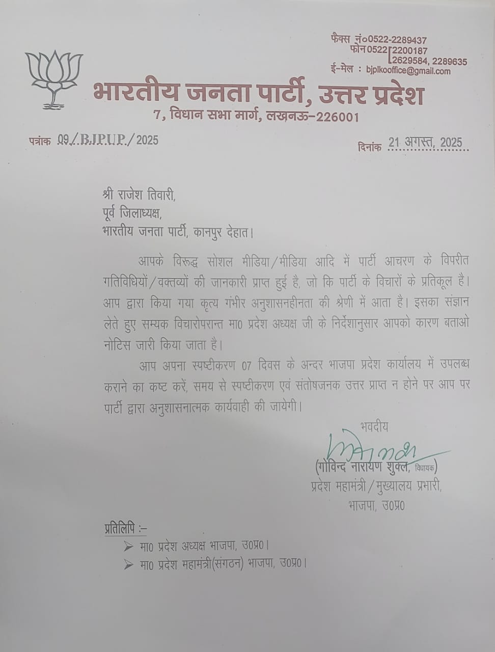 प्रदेश महामंत्री (मुख्यालय प्रभारी) गोविन्द नारायण शुक्ल की ओर से जारी पत्रों में कहा गया है कि संबंधित नेताओं के सोशल मीडिया और मीडिया के माध्यम से पार्टी विरोधी गतिविधियां व वक्तव्य सामने आए हैं। इसे गंभीर अनुशासनहीनता की श्रेणी में रखते हुए कारण बताओ नोटिस जारी किया गया है।